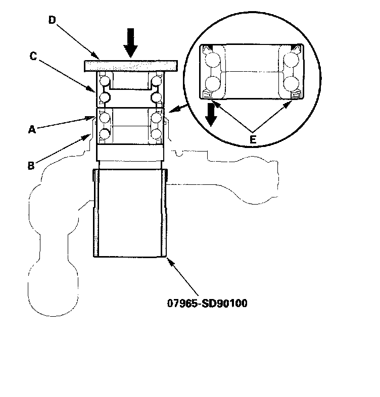 7. Press a new wheel bearing (A) into the knuckle (B) using the old bearing (C), a steel plate (D), the special tool, and a press. Be careful not to damage the sleeve of the pack seal.