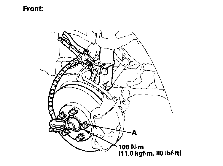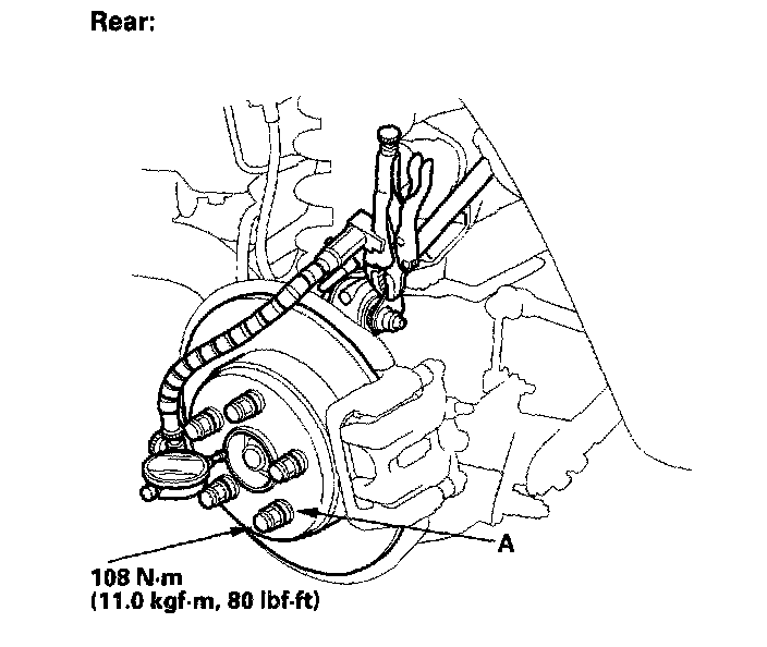 2. Install suitable flat washers (A) and wheel nuts, and tighten the nuts to the specified torque to hold the brake disc securely against the hub.