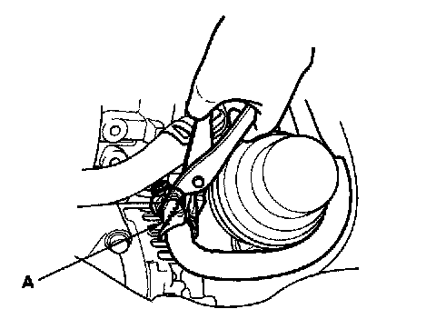 2. At idle, make sure there is a clicking sound from the PCV valve when the hose between the PCV valve and intake manifold is lightly pinched (A) with your fingers or pliers.