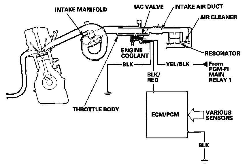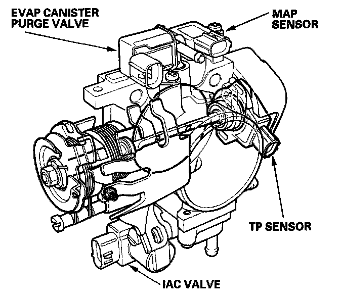 The throttle body is a single-barrel side draft type. The lower portion of the idle air control (IAC) valve is heated by engine coolant from the cylinder head.