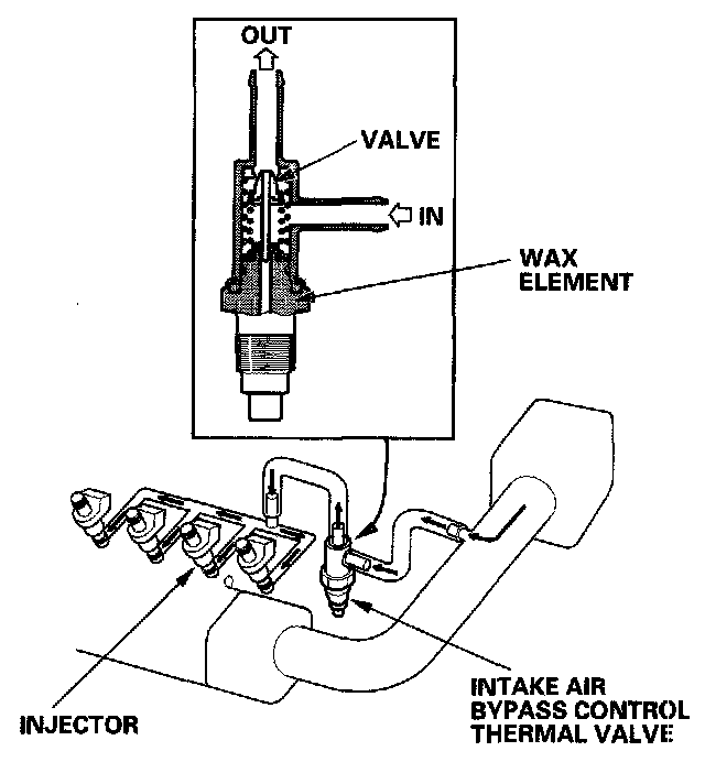 When the engine is running, and the engine coolant temperature is less than 113 °F (45 °C), the intake air bypass control thermal valve sends air to the injector.