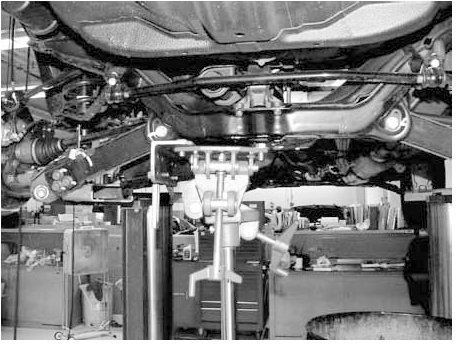3. Support the rear suspension cross beam with a powertrain lift or commercially available jack as shown.