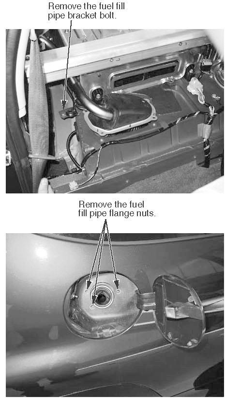 5. Remove the two lower rear cross beam bolts, the two fuel fill pipe bracket bolts, and the fuel fill pipe gasket.