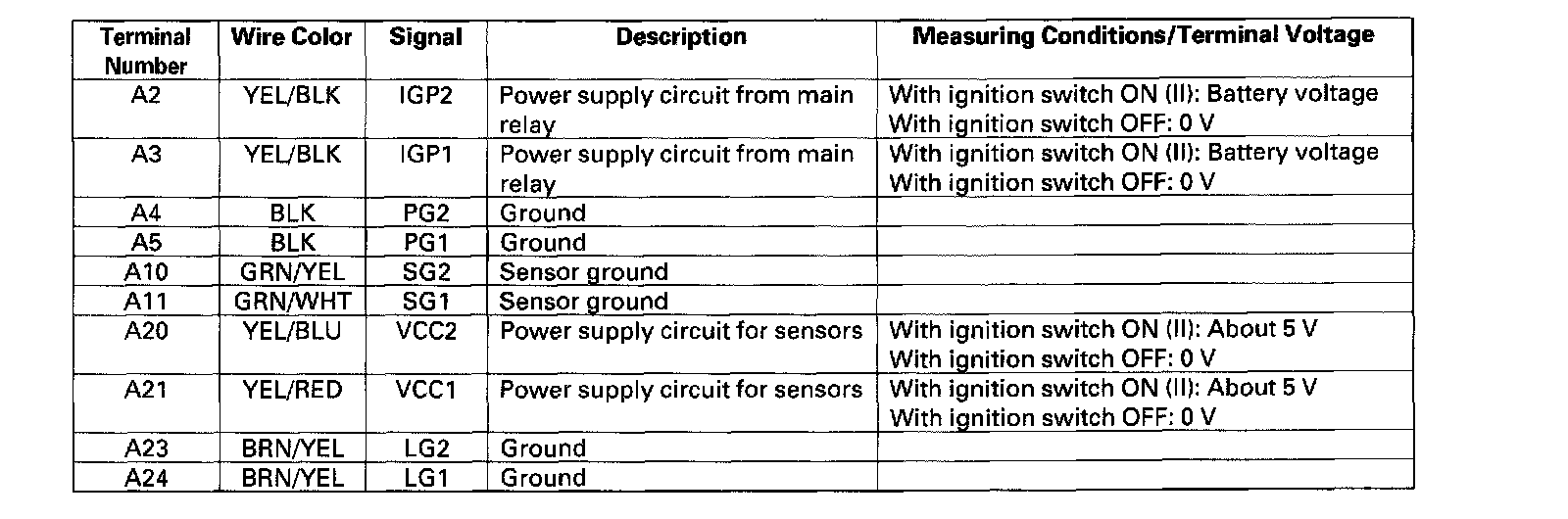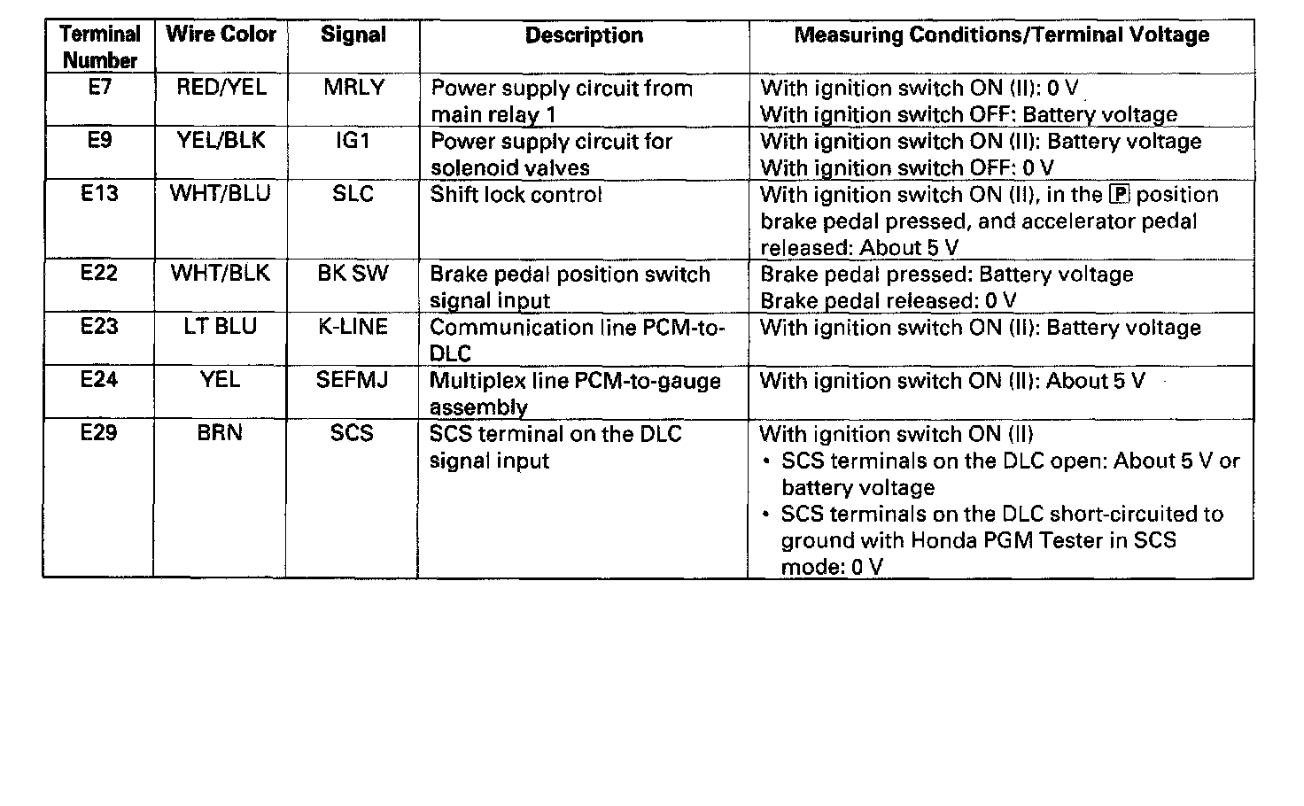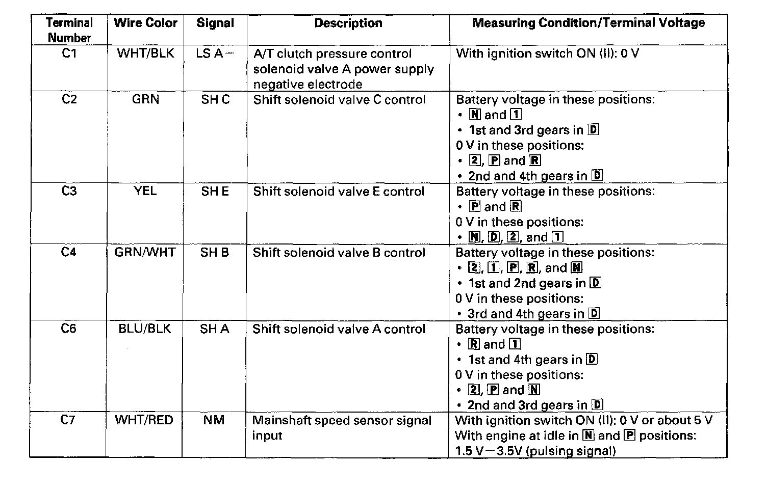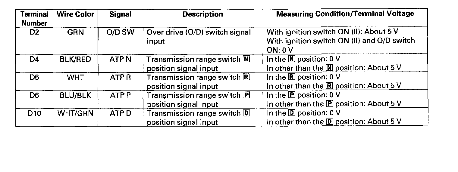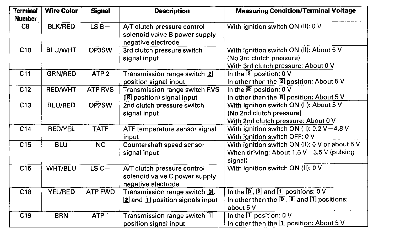 The PCM terminal voltage and measuring conditions are shown for the connector terminals that are related to the A/T control system.