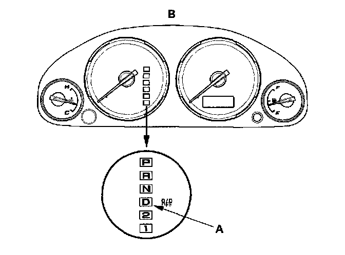 When the powertrain control module (PCM) senses an abnormality in the input or output systems, the (D) indicator (A) in the gauge assembly (B) will usually blink.