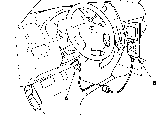 When the data link connector (DLC) (A) (located under the dash behind the center console) is connected to the OBDII Scan Tool or Honda PGM Tester (B), it will indicate the diagnostic trouble code (DTC) when the ignition switch is turned ON (II).