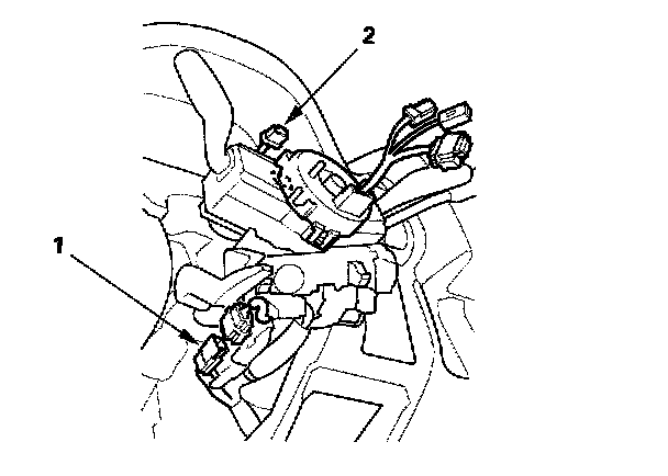 8. Disconnect the dashboard wire harness B 4P connector (1) from the cable reel, then disconnect the dashboard wire harness B 5P connector (2) from the cable reel.