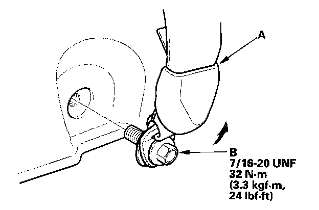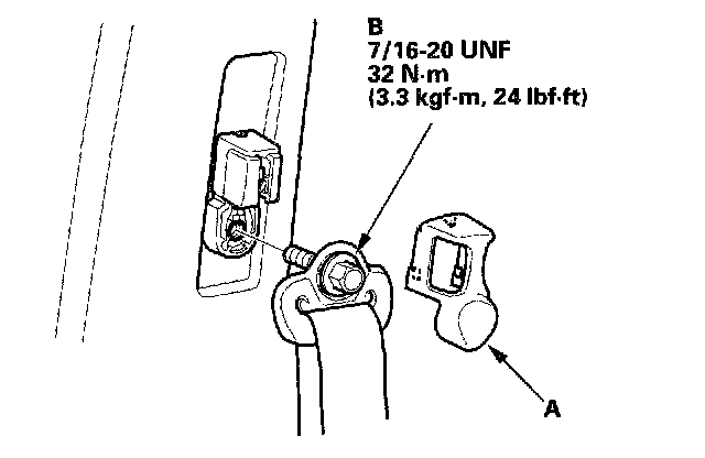 4. Pull the lower anchor cover (A) back, and remove the lower anchor bolt (B).