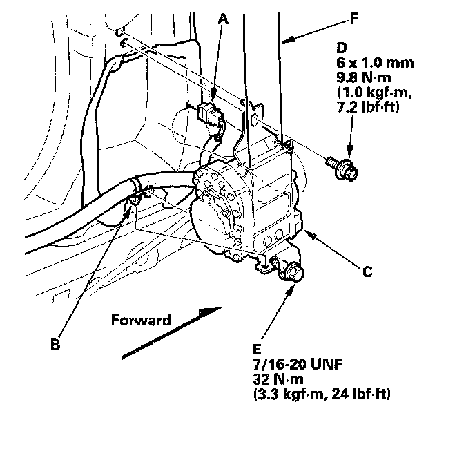 7. Disconnect the seat belt tensioner connector (A), and detach the harness clip (B) from the retractor (C). Remove the upper retractor mounting bolt (D), and the lower retractor bolt (E), then remove the front seat belt (F) and retractor.