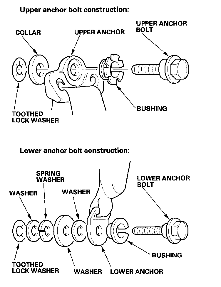 - Assemble the washers, collar, and bushing on the upper and lower anchor bolts as shown.