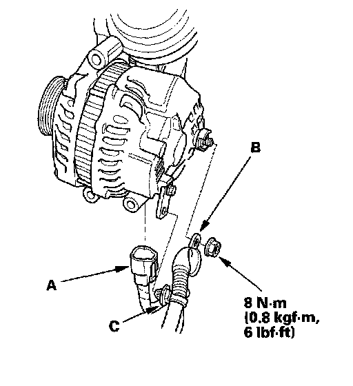 7. Disconnect the alternator connector (A) and BLK wire (B), and remove the harness clamp (C) from the alternator.