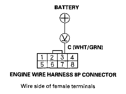 4. Measure voltage between the engine wire harness 8P connector terminal No.3 and the positive terminal of the battery.