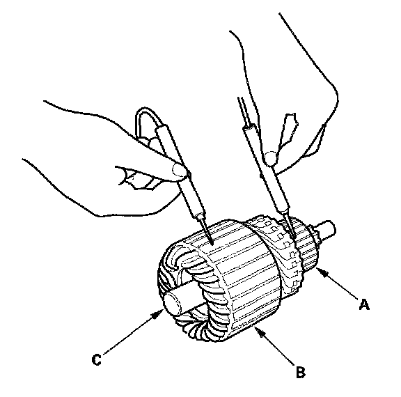 10. Check with an ohmmeter that no continuity exists between the commutator (A) and armature coil core (B), and between the commutator and armature shaft (C). If continuity exists, replace the armature.