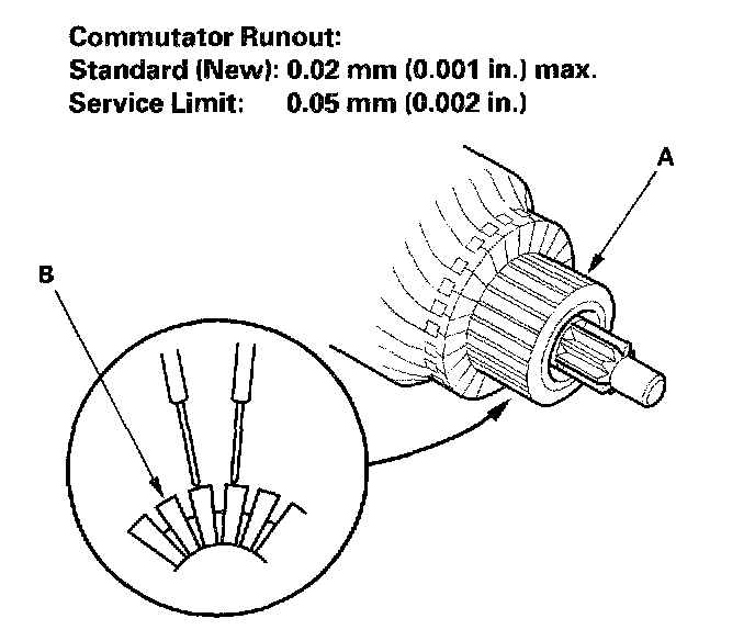 - If the commutator runout is not within the service limit, replace the armature.