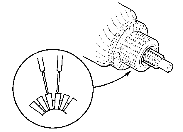 8. Check for continuity between the segments of the commutator. If an open circuit exists between any segments, replace the armature.