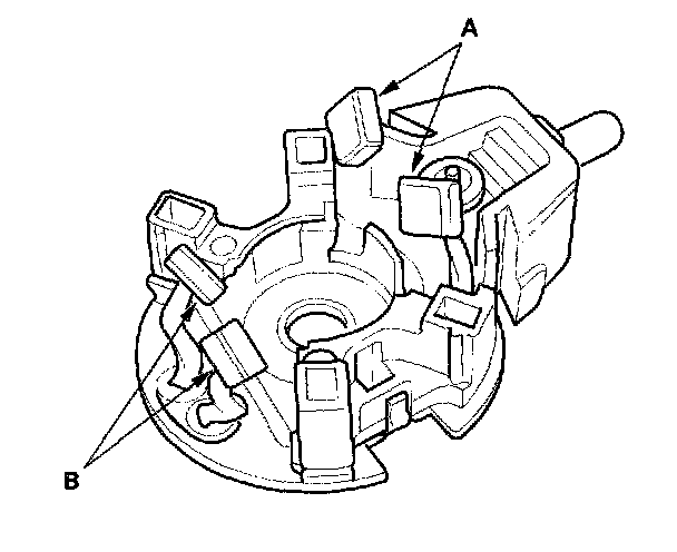 12. Check that there is no continuity between the (+) brush holder (A) and (-) brush holder (B). If there is continuity, replace the brush holder assembly.