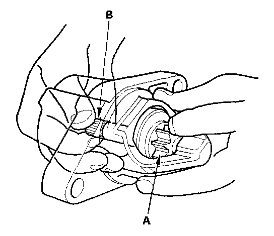 14. Holding the drive gear (A), turn the gear shaft (B) clockwise. Check that the drive gear comes out to the other end. If the drive gear does not move smoothly, replace the gear cover assembly.