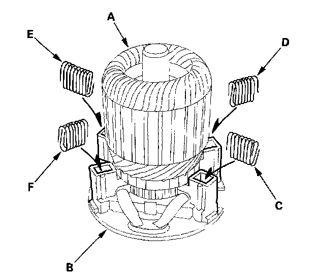 18. Squeezing a spring (C), insert it in the hole on the brush holder, and push it until it bottoms. Repeat this for the other three springs (D, E and F).