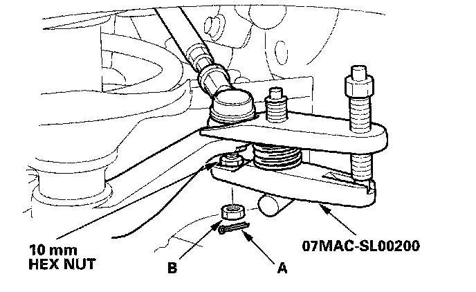 15. Wipe off any grease contamination from the ball joint tapered section and threads. Then reconnect the tie-rod end (A) to the damper steering arms. Install the 10 mm nut (B), and tighten it to the specified torque.