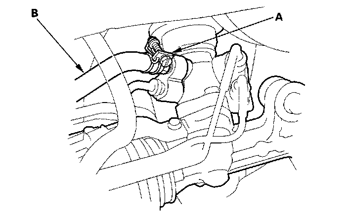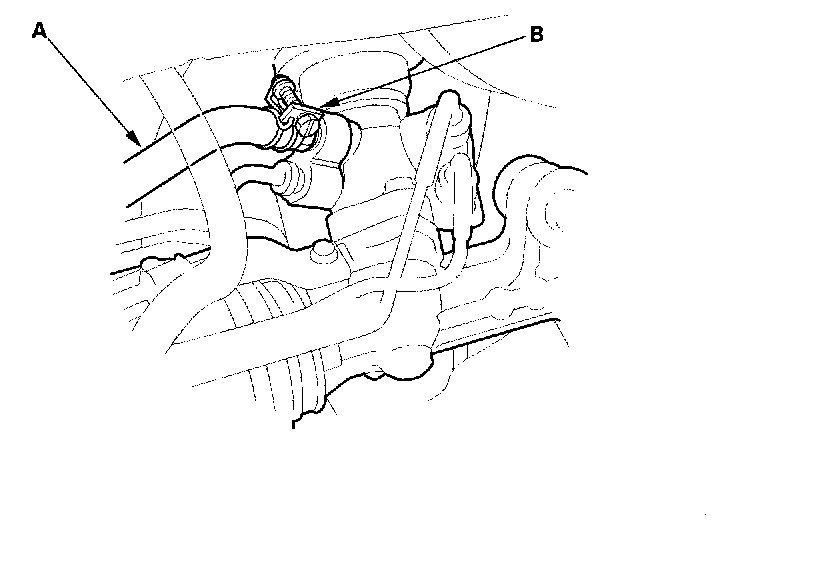 9. Loosen the adjustable hose clamp (A) and disconnect the return hose (B).