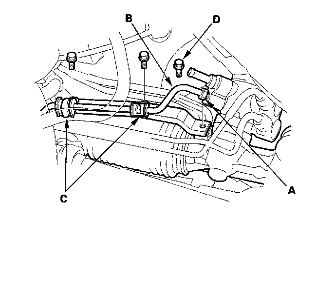 10. On the driver's side, loosen the 14 mm flare nut (A) and disconnect the feed line (B). Remove the bolts from the feed line clamps (C). Remove the P/S return line bracket bolt (D).