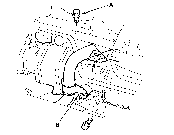 13. On the passenger's side, install the P/S return line bracket attaching bolt (A) and return line clamp (B) on the gearbox. Make sure that there is no interference between the feed and return lines and any other parts. Make sure the return line is routed between the gearbox and the right tie-rod.