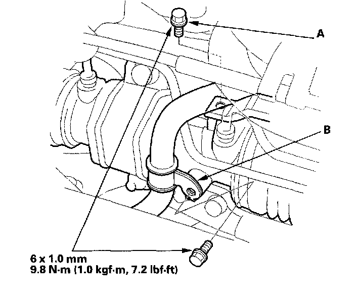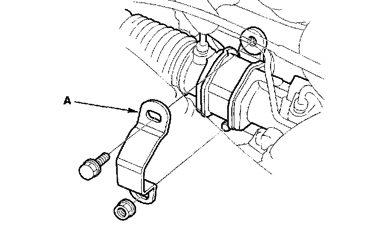 11. On the passenger's side, remove the P/S return line bracket attaching bolt (A) and return line clamp (B).