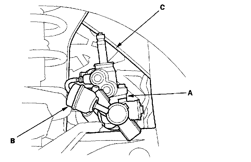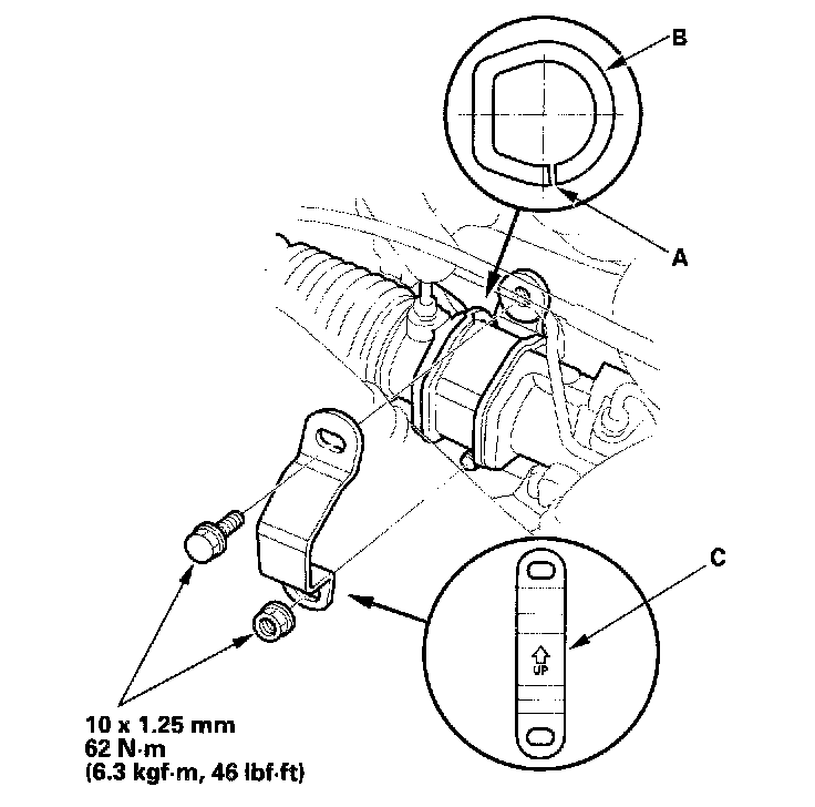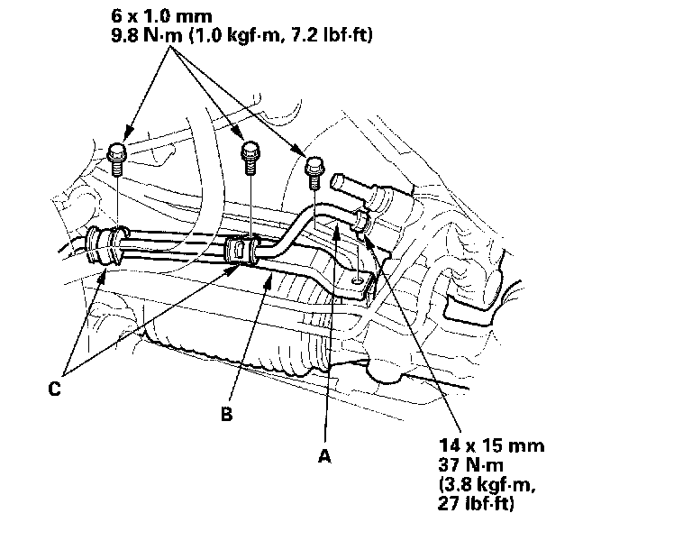 11. Install the P/S return line bracket (B), then install the feed line clamps (C). Tighten the mounting bolts to the specified torque.
