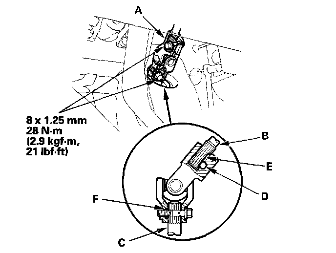 ^ Slip the lower end of the steering joint onto the pinion shaft (C) (line up the bolt hole with the groove (F) around the shaft), and loosely install the lower joint bolt. Be sure that the lower joint bolt is securely in the groove in the pinion shaft.