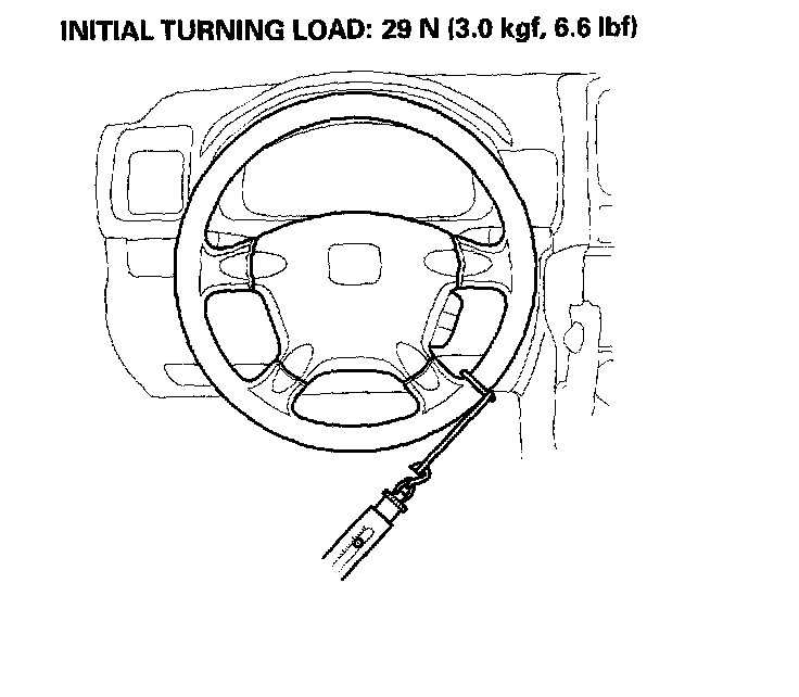 3. Attach a commercially available spring scale to the steering wheel. With the engine idling and the vehicle on a clean, dry floor, pull the scale as shown and read it as soon as the tires begin to turn.