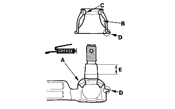 ^ Keep grease off the boot mounting area (D) and the tapered section (E) of the ball pin.