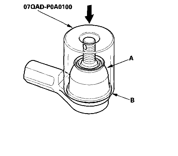 4. Install the new boot (A) using the special tool. The boot must not have a gap at the boot installation sections (B). After installing the boot, check the ball pin tapered section for grease contamination, and wipe it if necessary.