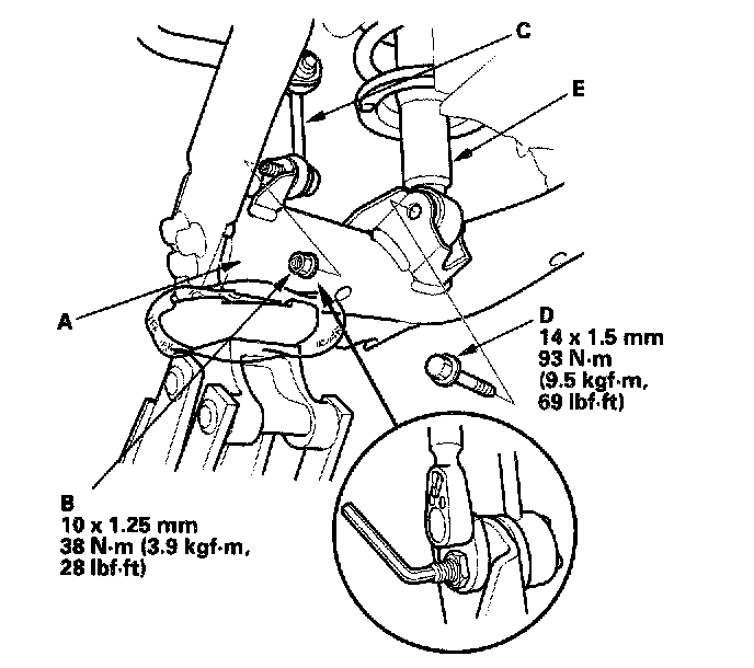 5. Remove the flange bolt (D), and disconnect the damper (E) from the trailing arm.