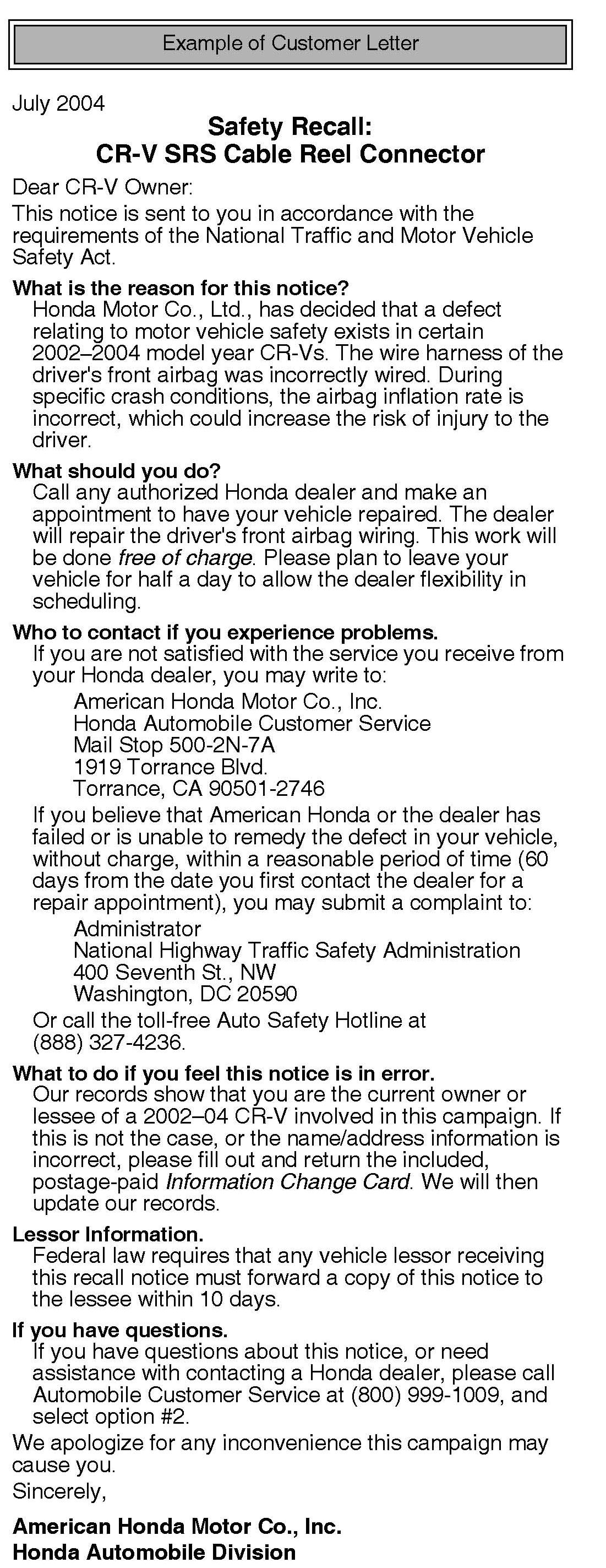 Safety Recall: CR-V SRS Cable Reel Connector