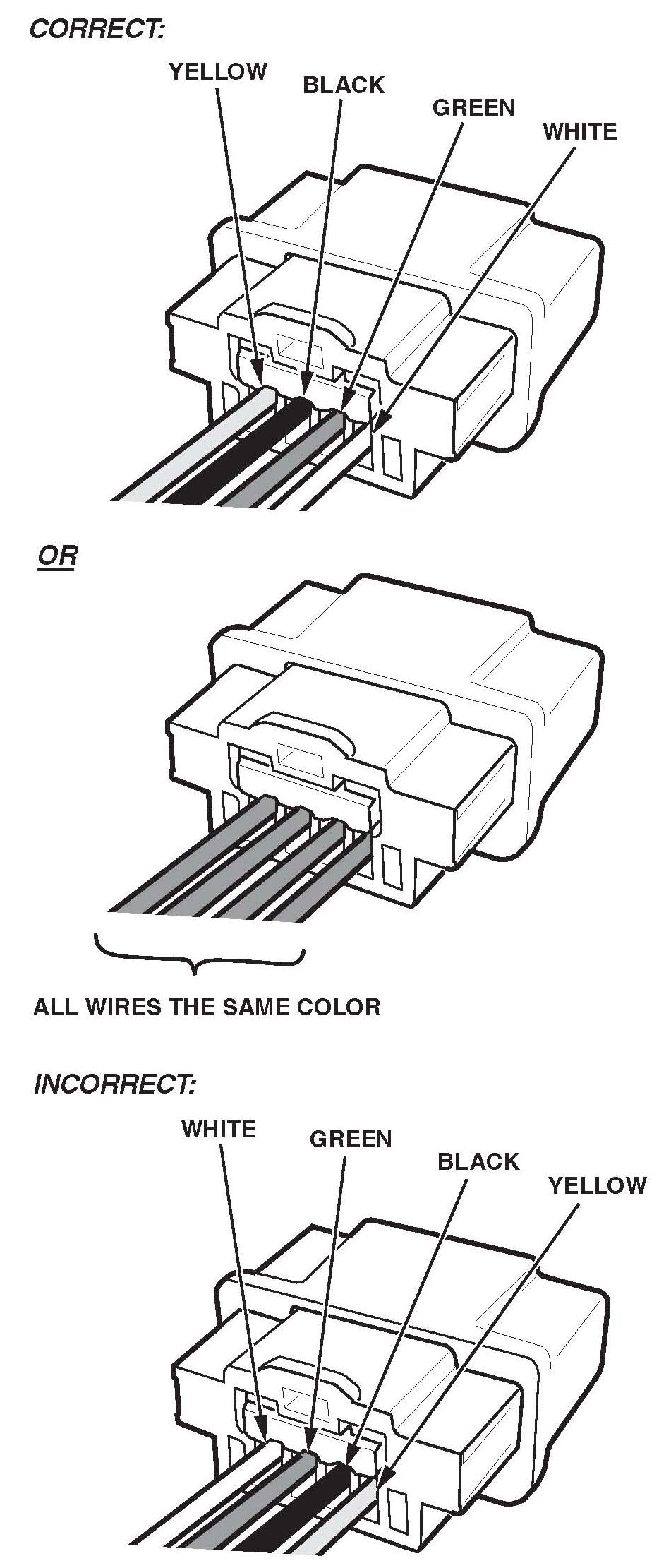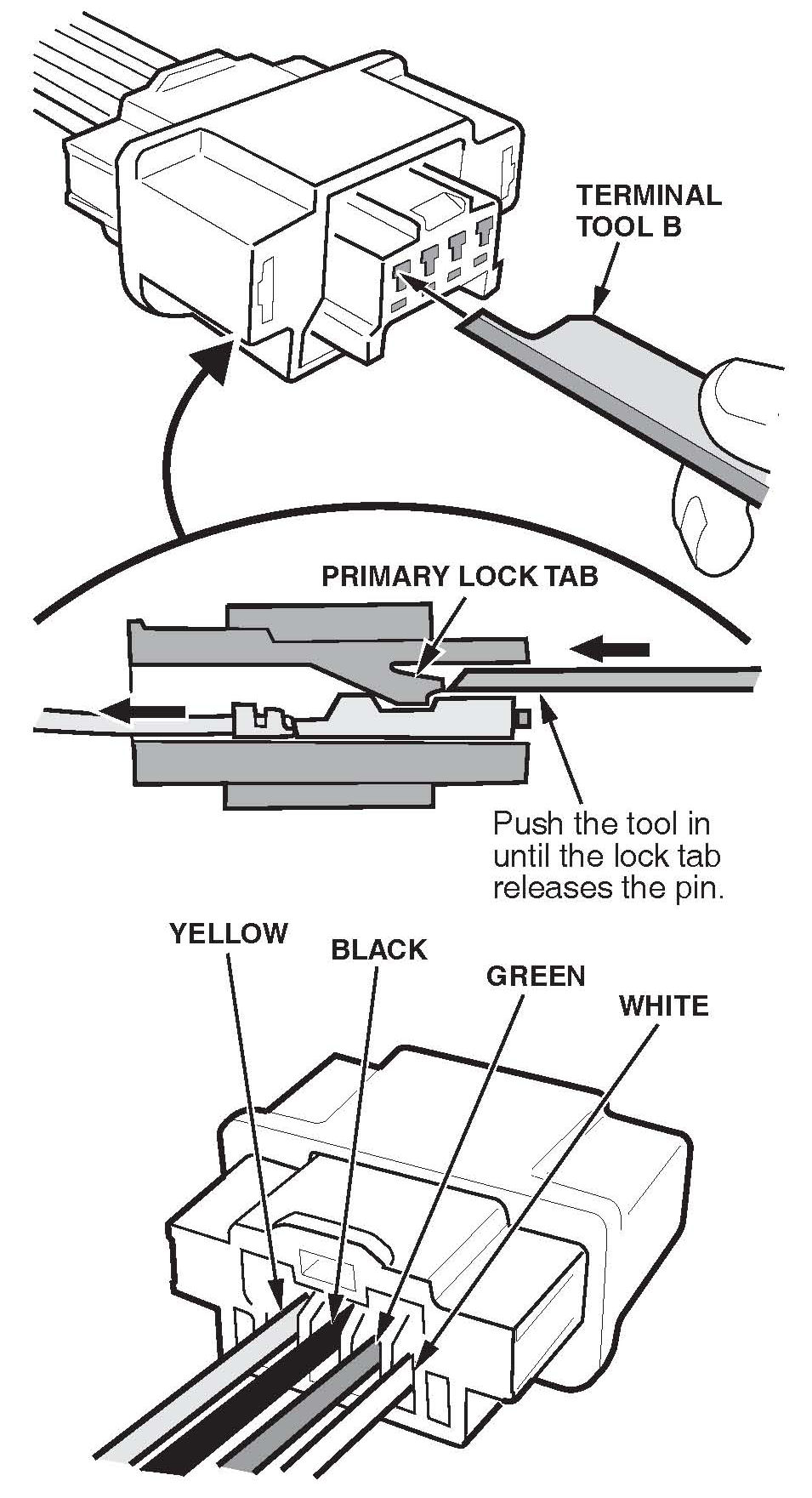 13. Transfer the terminals to the new connector in the correct order: YELLOW, BLACK, GREEN, WHITE.