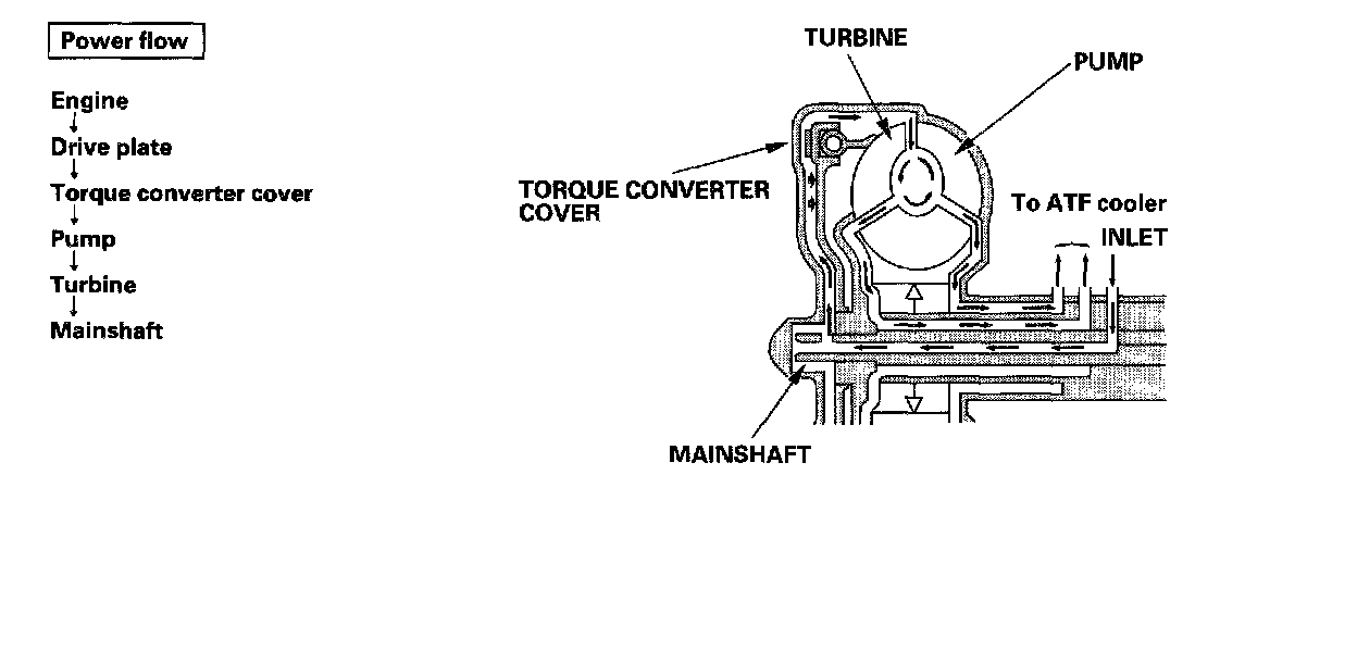 Lock-up SystemThe lock-up mechanism of the torque converter clutch operates in the D position (2nd, 3rd and 4th) and the D position over drive off mode (3rd). The pressurized fluid is drained from the back of the torque converter through a fluid passage, causing the torque converter clutch piston to be held against the torque converter cover. As this takes place, the mainshaft rotates at the same speed as the engine crankshaft. Together with the hydraulic control, the PCM optimizes the timing and amount of the lock-up mechanism. When shift solenoid valve E is turned on by the PCM, the shim solenoid valve E pressure switches the lock-up shift valve lock-up on and off. The A/T clutch pressure control solenoid valve A and the lock-up control valve control the amount of lock-up.