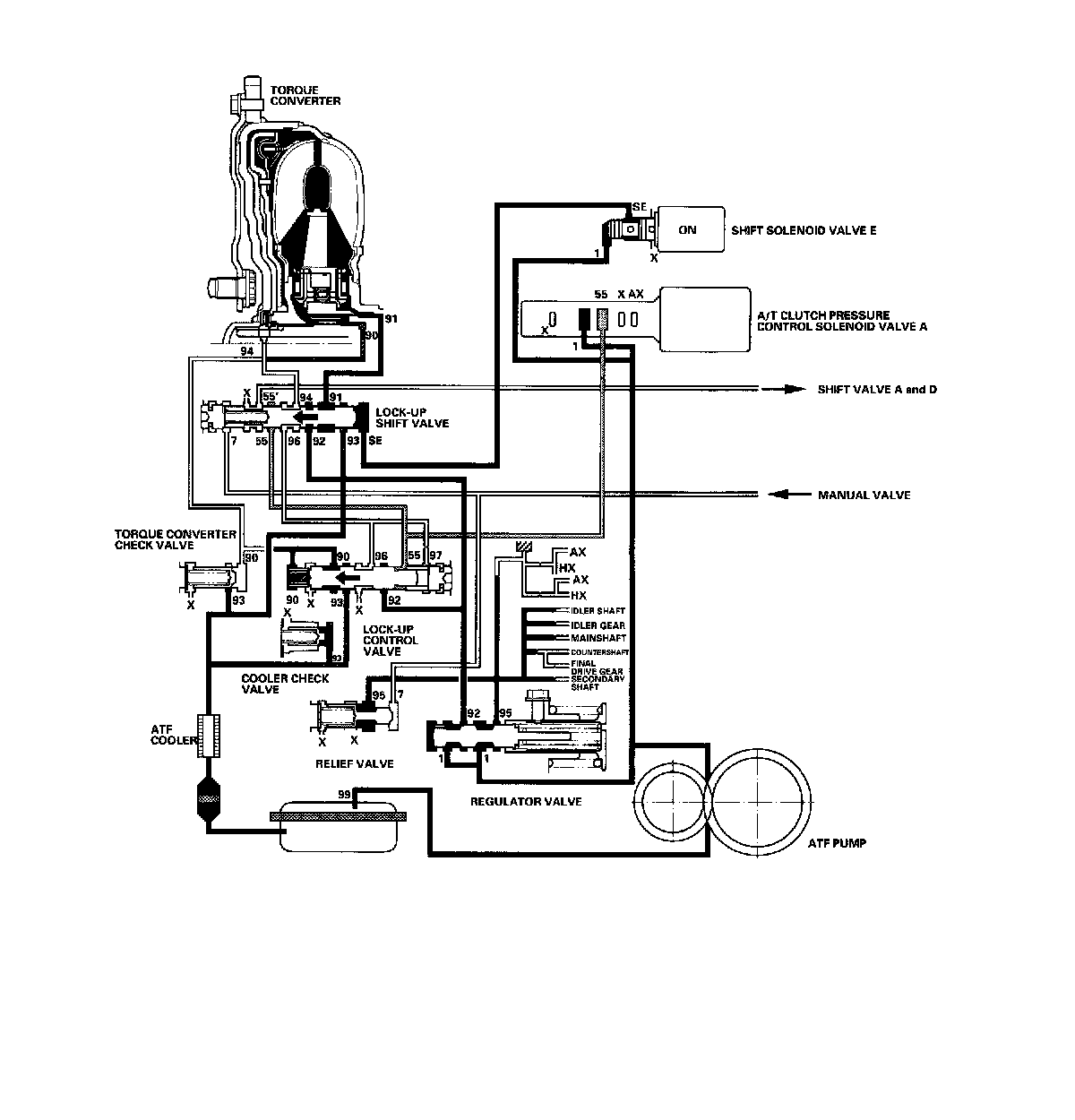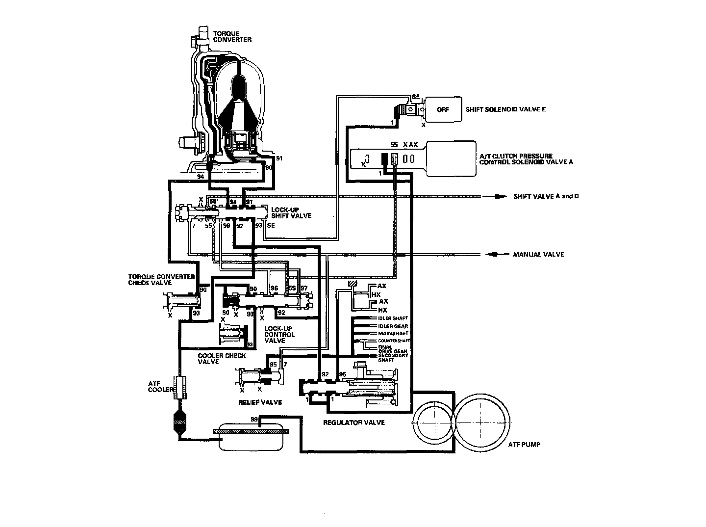 Shift solenoid valve E is turned OFF by the PCM, and shift solenoid valve E pressure (SE) is not applied to the lock-up shift valve. The lock-up shift valve stays in the right side to uncover the ports of torque converter pressure leading to the led side of the torque converter and releasing from the right side of the torque converter. Torque converter pressure (92) changes to (94) at the lock-up shift valve, and enters into the led side of the torque converter to disengage the torque converter clutch. The torque converter clutch piston is kept away from the torque converter cover, and the torque converter clutch lock-up is OFF.