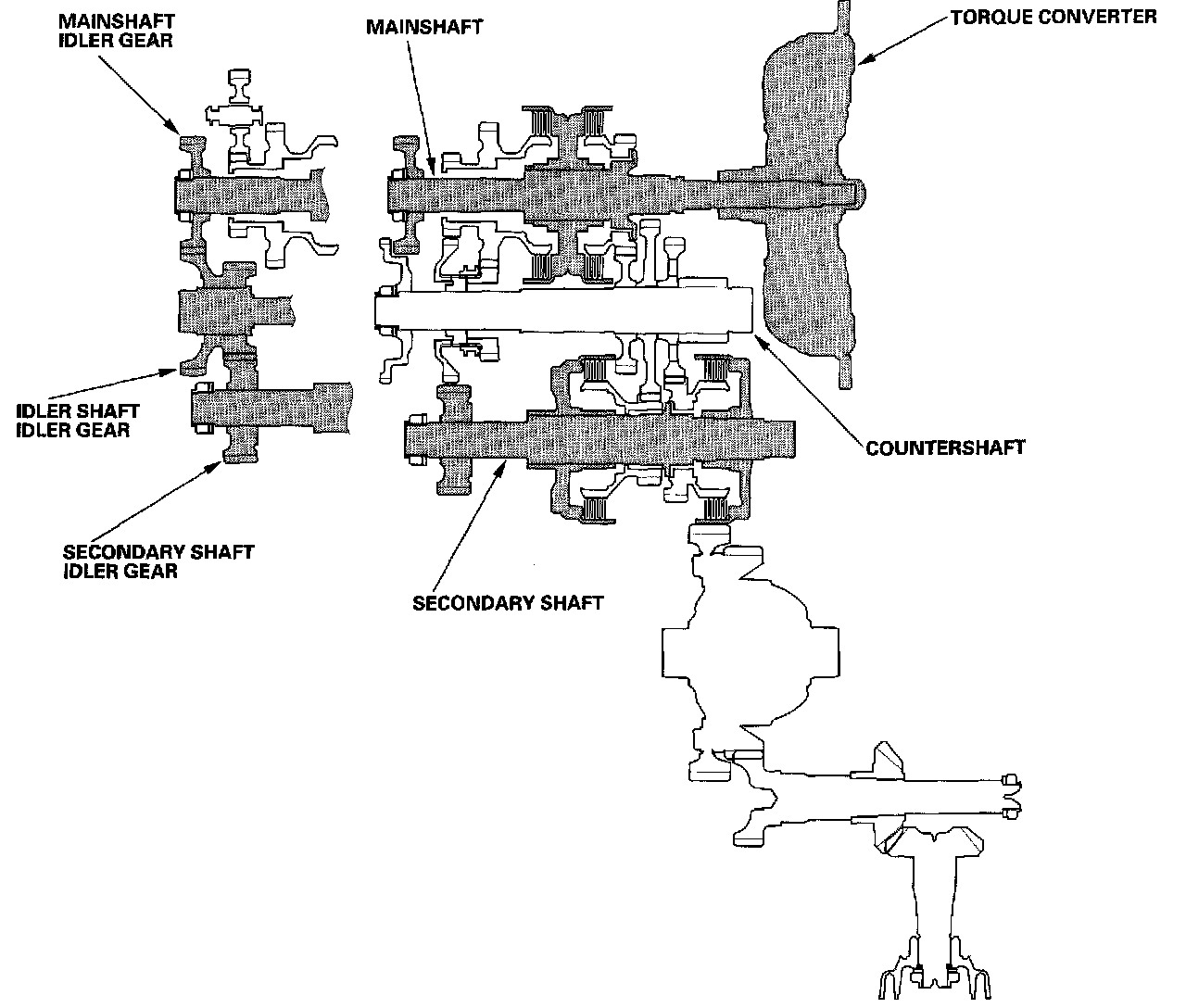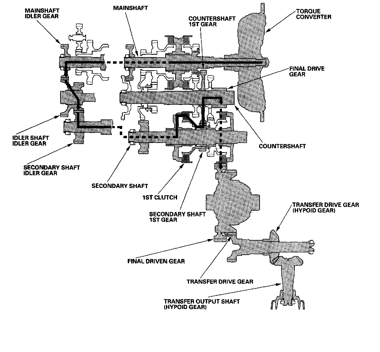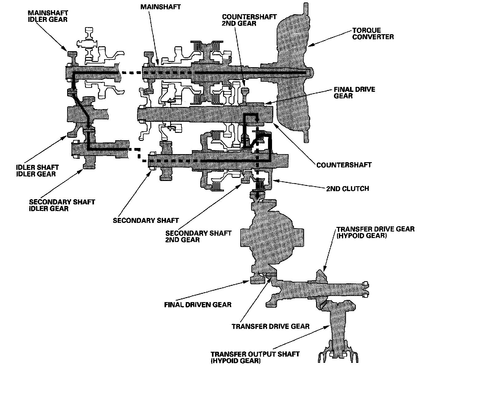 Engine power transmitted from the torque converter drives the mainshaft idler gear, the idler shaft idler gear, and the secondary shaft idler gear, but hydraulic pressure is not applied to the clutches. Power is not transmitted to the countershaft.