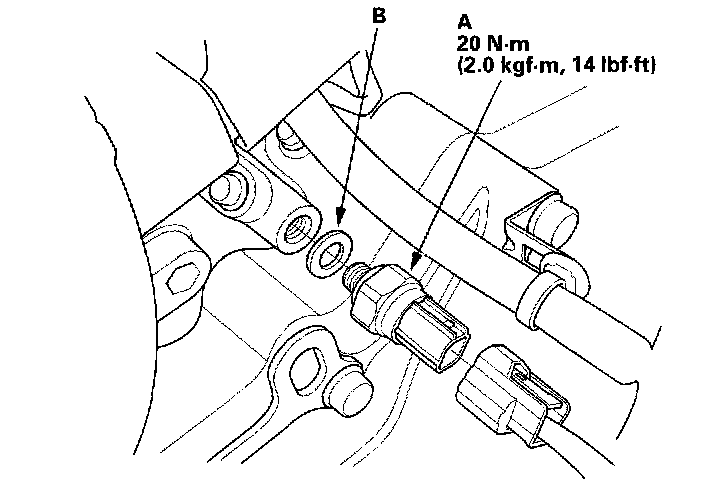 3. Remove the 2nd clutch pressure switch and use a new sealing washer (B). Tighten the switch on the metal part, not the plastic part.