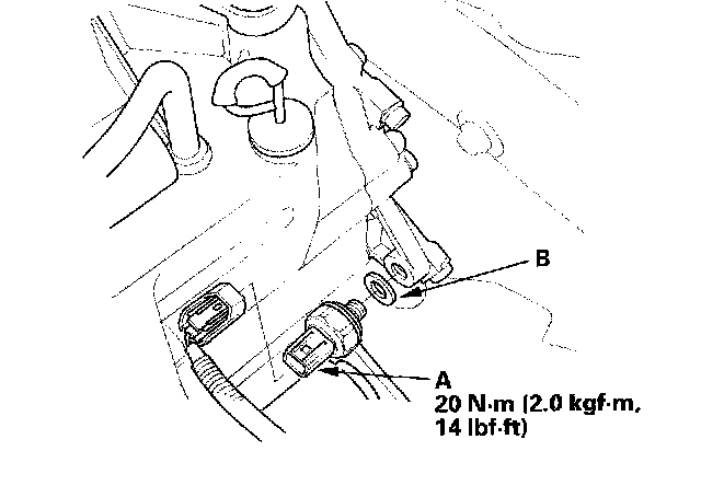 2. Remove the 3rd clutch pressure switch and use a new sealing washer (B). Tighten the switch on the metal part, not the plastic part.