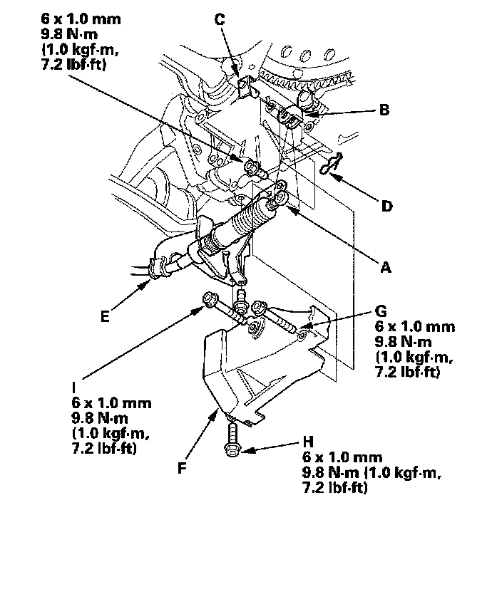 4. Secure the shift cable bracket (H) with the bolts, and install the shift cable cover (I), but do not tighten the bolts.