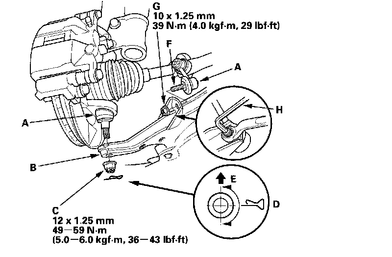 29. Connect the ball joints (F) to the lower arms, and install the nuts (G). Insert a 5 mm hex wrench (H) in the top of the ball joint pins, and tighten the nuts.