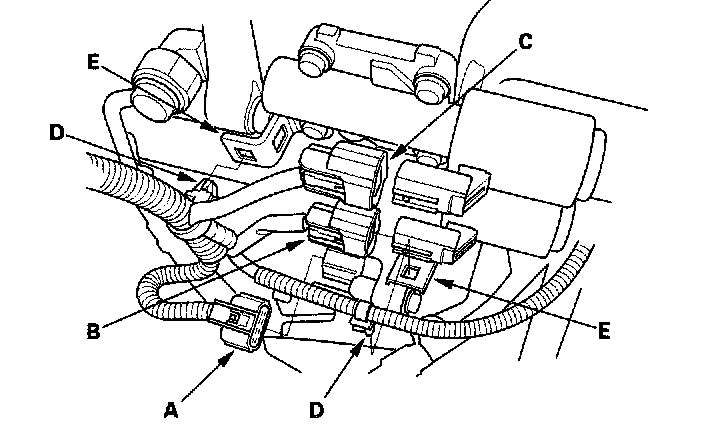 32. Connect the shift solenoid harness connector (A), A/T clutch pressure control solenoid valve B connector, and solenoid valve C connector. Install the harness clamps (D) on the clamp brackets (E).