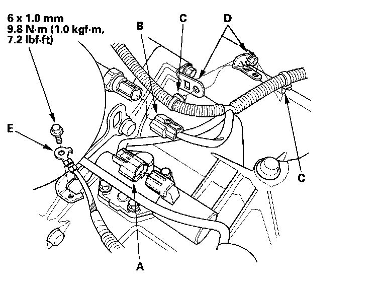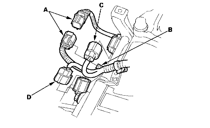40. Connect the A/T clutch pressure control solenoid valve A connector and 2nd clutch pressure switch connector (B), and install the harness clamps (C) on the clamp brackets (D).