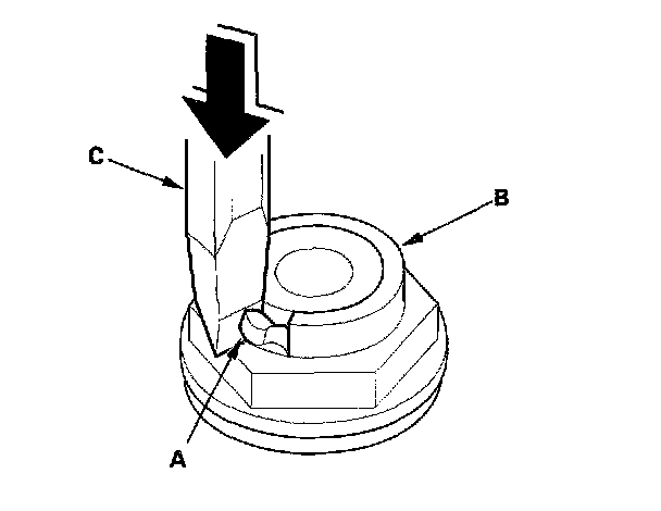 9. Cut the lock tab (A) of each shaft locknut (B) using a chisel (C). Then remove the locknuts and conical spring washers from each shaft.