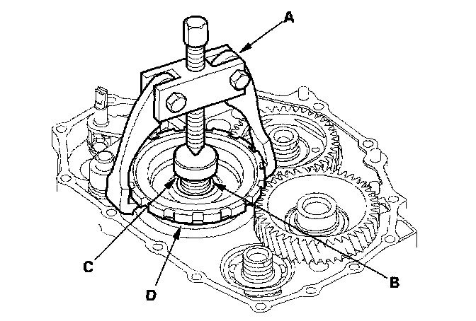 11. Set a two-jaw (or three-jaw) puller (A) on the countershaft (B) by putting a spacer (C) between the puller and countershaft, then remove the park gear (D).