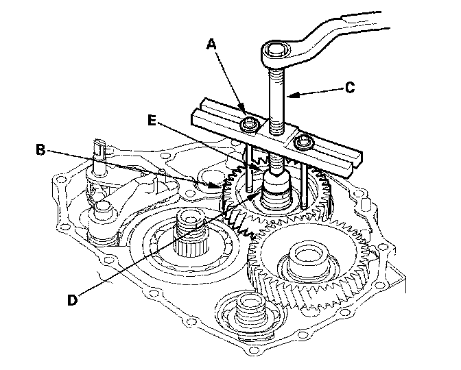 12. Install 6 x 1.0 mm bolts (A) on the mainshaft idler gear (B). Set a puller (C) on the mainshaft (D) with putting a spacer (E) between the puller and mainshaft, then remove the mainshaft idler gear.