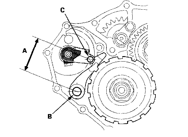 2. Measure the distance (A) between the park pawl shaft (B) and the park lever roller pin (C).