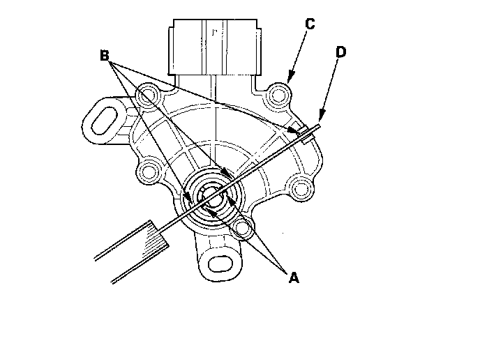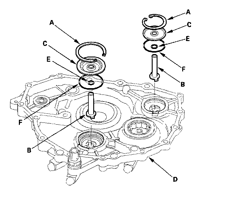1. Remove the snap rings (A), ATF feed pipes (B), and feed pipe flanges (C) from the end cover (D).