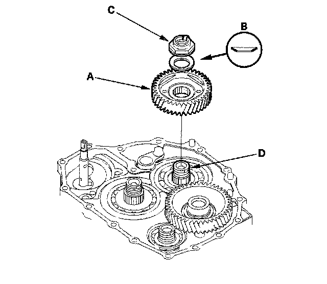 3. Install the mainshaft idler gear (A), old conical spring washer (B), and old locknut (C) on the mainshaft (D), and tighten the locknut to 226 Nm (23.0 kgf-cm, 166 ft. lbs.).